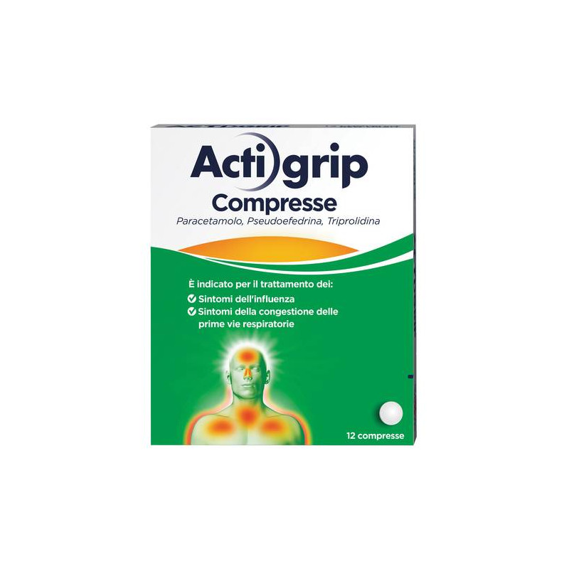 L'uso di Actigrip deve essere evitato se si sta gia' utilizzando qualsiasi altro medicinale contenente paracetamolo. I soggetti che soffronodi alcolismo devono rivolgersi al proprio medico prima di assumere paracetamolo. I pazienti con malattie epatiche devono consultare il medico prima di assumere Actigrip. I pazienti con emicrania trattati con vasocostrittori alcaloidi ergotaminici devono consultare il medico prima di assumere Actigrip (vedere paragrafo 4.5). Reazioni cutanee gravi:nei pazienti trattati con paracetamolo, sono state riportate molto raramente gravi reazioni cutanee come pustolosi esantematica acuta generalizzata (AGEP), sindrome di Stevens-Johnson (SJS), necrolisi epidermica tossica (TEN) e reazione da farmaco con eosinofilia e sintomi sistemici (DRESS). I pazienti devono essere informati sui segni delle reazioni cutanee serie e l'uso deve essere interrotto ai primi segni di comparsa di rash cutaneo o qualsiasi altro segno di ipersensibilita' (vedere pargrafo 4.8). Nelle prime fasi della terapia i pazienti sembranoessere a piu alto rischio: l'insorgenza della reazione si verifica nella maggior parte dei casi nelle prime fasi del trattamento. Reazioni cutanee gravi come la pustolosi esantematica acuta e generalizzata (AGEP) sono state riportate molto raramente con prodotti contenenti pseudoefedrina. Questa eruzione pustolosa acuta puo' verificarsi entro i primi 2 giorni di trattamento, con febbre e numerose, piccole pustole, per lo piu' non follicolari, derivanti da un eritema edematoso molto diffuso e localizzate principalmente sulle pieghe cutanee, sul tronco e sugli arti superiori. I pazienti devono essere attentamente monitorati.Se si osservano segni e sintomi come formazione di numerose piccole pustole con o senza piressia o eritema, la somministrazione di Actigripdeve essere interrotta (vedere paragrafo 4.8). Se la febbre persisteper piu' di tre giorni oppure se i sintomi non migliorano o ne compaiono altri entro cinque giorni oppure sono accompagnati da febbre elevata, esantema, quantita' eccessiva di muco e tosse persistente, consultare il medico prima di continuare la somministrazione. Per la presenzadi pseudoefedrina, i pazienti devono essere informati che il trattamento deve essere interrotto in caso insorgano: ipertensione, tachicardia, palpitazioni o aritmia cardiaca, nausea o eventuali segni neurologici (come comparsa o esacerbazione di mal di testa). Se si sviluppano improvviso dolore addominale, sanguinamento rettale o altri sintomi di colite ischemica (vedere paragrafo 4.8), la pseudoefedrina deve essereinterrotta ed e' necessario consultare un medico. Sindrome da encefalopatia posteriore reversibile (PRES) e sindrome da vasocostrizione cerebrale reversibile (RCVS): sono stati segnalati casi di PRES e RCVS conl'uso di prodotti contenenti pseudoefedrina (vedere paragrafo 4.8). Il rischio e' aumentato nei pazienti con ipertensione severa o non controllata, o con severa malattia renale acuta o cronica/insufficienza renale (vedere paragrafo 4.3). La pseudoefedrina deve essere interrottae si deve richiedere assistenza medica immediata se si verificano i seguenti sintomi: improvvisa cefalea severa o cefalea a rombo di tuono,nausea, vomito, confusione, convulsioni e/o disturbi visivi. La maggior parte dei casi di PRES e RCVS segnalati si sono risolti dopo la sospensione e un trattamento appropriato. Neuropatia ottica ischemica: conla pseudoefedrina sono stati riportati casi di neuropatia ottica ischemica. La pseudoefedrina deve essere interrotta se dovesse verificarsiimprovvisa perdita della vista o riduzione dell'acuita' visiva, ad esempio in caso di scotoma. Rischi di abuso: la pseudoefedrina comportail rischio di abuso. Dosi aumentate possono sostanzialmente causare tossicita'. L'uso continuativo puo' portare alla tolleranza, con conseguente aumento del rischio di sovradosaggio. La dose massima raccomandata e la durata del trattamento non devono essere superate (vedere paragrafo 4.2). L'uso degli antistaminici puo' mascherare i primi segni diototossicita' di certi antibiotici. Ai pazienti con patologie respiratorie quali enfisema e bronchite cronica deve essere consigliato di consultare un medico prima di utilizzare triprolidina. Puo' causare sonnolenza (vedere paragrafo 4.8). La triprolidina puo' aumentare gli effetti sedativi di sostanze che deprimono il sistema nervoso centrale comealcol, sedativi, tranquillanti (vedere paragrafo 4.5). E' necessarioinformare i pazienti che si deve evitare l'uso di bevande alcoliche durante il trattamento con Actigrip e che e' opportuno consultare il medico prima di assumere Actigrip in concomitanza con medicinali che deprimono il sistema nervoso centrale. Dosi elevate o prolungate del medicinale possono provocare un'epatopatia ad alto rischio e alterazioni acarico del rene e del sangue anche gravi. In caso di insufficienza renale ed epatocellulare utilizzare solo in caso di effettiva necessita'e sotto il diretto controllo medico. Durante il trattamento con paracetamolo prima di assumere qualsiasi altro farmaco, controllare che noncontenga lo stesso principio attivo, poiche' se il paracetamolo e' assunto in dosi elevate si possono verificare gravi reazioni avverse. Ilsovradosaggio puo' portare a danno epatico. E' necessaria pertanto un'attenta supervisione medica sia per gli adulti che per i bambini anchese non compaiono segni o sintomi evidenti. Invitare il paziente a contattare il medico prima di associare qualsiasi altro farmaco (vedere paragrafo 4.5). Sono stati segnalati casi di acidosi metabolica con gapanionico elevato (HAGMA, high anion gap metabolic acidosis) dovuta adacidosi piroglutamica in pazienti con malattie gravi, quali compromissione renale severa e sepsi, o in pazienti con malnutrizione o altre fonti di carenza di glutatione (ad es. alcolismo cronico) che sono stati trattati con paracetamolo a dose terapeutica per un periodo prolungato o con un'associazione di paracetamolo e flucloxacillina. Se si sospetta