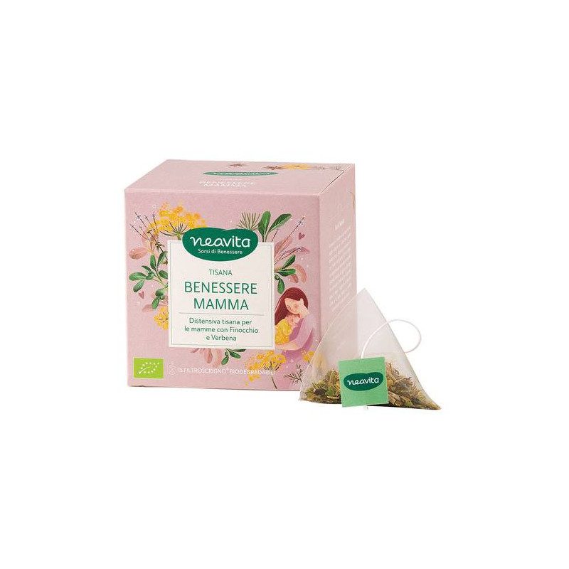 Neavita Benessere Mamma tisana ha alla sua origine c'è una selezione di piante biologiche particolarmente consigliate per le neomamme, per donare un dolce effetto rasserenante e confortante. Un caldo abbraccio per il corpo e la mente.