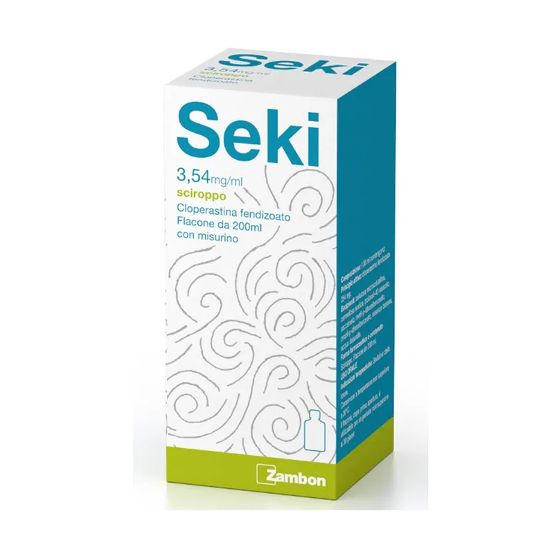 AVVERTENZE E' consigliata cautela nell'uso in pazienti affetti da ipertensione intraoculare, ipertrofia prostatica o ostruzione della vescica. Inibendoil riflesso della tosse, Seki puo' interferire con l'espettorazione ed aumentare la resistenza del tratto respiratorio. Pertanto, si raccomanda estrema cautela, in pazienti con tosse produttiva cronica associata a fumo, enfisema polmonare o asma. Informazioni importanti su alcuni eccipienti, etanolo (contenuto nell'aroma banana): questo medicinalecontiene 0,0011 ml di alcol (etanolo) in ogni dose da 3,75 ml (tacca"Bambini") e 0,0022 ml di alcol (etanolo) in ogni dose da 7,5 ml (tacca "Adulti"). La quantita' in una dose di questo medicinale e' equivalente a meno di 1 ml di birra o 1 di vino. La piccola quantita' di alcolin questo medicinale non produrra' effetti rilevanti. Paraidrossibenzoati: questo medicinale contiene metil-para-idrossibenzoato (E218) e propil-para-idrossibenzoato (E216) che possono causare reazioni allergiche (anche ritardate). Propilene glicole (contenuto nell'aroma banana): questo medicinale contiene 8,6 mg di propilene glicole in 3,75 ml (tacca "Bambini") e 17, 3 mg di propilene glicole in 7,5 ml (tacca "Adulti"). Saccarosio: questo medicinale contiene 1,687 g di saccarosio perdose da 3,75 ml (tacca "Bambini") e 3,375 g di saccarosio per dose da7, 5 ml (tacca "Adulti"). Da tenere in considerazione in persone affette da diabete mellito. I pazienti affetti da rari problemi ereditaridi intolleranza al fruttosio, da malassorbimento di glucosio-galattosio o da insufficienza di sucrasi isomaltasi, non devono assumere questomedicinale. Sodio: questo medicinale contiene meno di 1 mmol (23 mg)di sodio per dose, cioe' essenzialmente 'senza sodio'. CATEGORIA FARMACOTERAPEUTICA Sedativi della tosse, escluse le associazioni con espettoranti. CONSERVAZIONE Conservare a temperatura inferiore a 30 gradi C. CONTROINDICAZIONI/EFF.SECONDAR Ipersensibilita' al principio attivo o ad uno qualsiasi degli eccipienti elencati al paragrafo 6.1. Per l'assenza di studi nella primissimainfanzia, il medicinale e' controindicato nei bambini al di sotto dei2 anni. DENOMINAZIONE SEKI 3,54 MG/ML SCIROPPO ECCIPIENTI Seki 3,54 mg/ml sciroppo cellulosa microcristallina, carmellosa sodica, poliossil-40-stearato, saccarosio, metil-para-idrossibenzoato, propil-para-idrossibenzoato, essenza banana (contenente etanolo, propileneglicole), acqua depurata. EFFETTI INDESIDERATI L'orticaria e' l'evento avverso piu' frequentemente osservato durantel'esperienza post-marketing. Si riporta di seguito un elenco relativoalla frequenza degli effetti indesiderati: Frequenza: molto comune (>=1/10); comune (>= 1/100, < 1/10); non comune (>= 1/1000, < 1/100); raro (>= 1/10000, < 1/1000); molto raro (< 1/10000), non noto (la frequenza non puo' essere definita sulla base dei dati disponibili). All'interno di ciascun gruppo di frequenza gli effetti indesiderati sono presentati in ordine decrescente di gravita'. Disturbi del sistema immunitario. Non noto: reazione anafilattica/anafilattoide. Patologie del sistema nervoso. Poco comune (>=1/1.000; <1/100): sonnolenza, bocca secca. Patologie della pelle e del tessuto sottocutaneo. Non noto: orticaria, eritema. Popolazione pediatrica: gli studi clinici e la sorveglianza post-marketing con cloperastina non hanno evidenziato differenze rilevanti per natura, frequenza, gravita' e reversibilita' delle reazioniavverse tra popolazione adulta e pediatrica. Segnalazione delle reazioni avverse sospette. La segnalazione delle reazioni avverse sospetteche si verificano dopo l'autorizzazione del medicinale e' importante,in quanto permette un monitoraggio continuo del rapporto beneficio/rischio del medicinale. Agli operatori sanitari e' richiesto di segnalarequalsiasi reazione avversa sospetta tramite il sistema nazionale di segnalazione all'indirizzo https://www.aifa.gov.it/content/segnalazioni-reazioni-avverse. GRAVIDANZA E ALLATTAMENTO Gravidanza: non sono disponibili informazioni in merito all'uso di Seki in gravidanza. Sebbene gli studi di tossicita' effettuati durante lagravidanza negli animali non abbiano evidenziato attivita' teratogenica e feto-tossicita', e' buona norma prudenziale non assumere il farmaco nei primi mesi della gravidanza e nell'ulteriore periodo solo in caso di effettiva necessita' sotto il diretto controllo del medico. Allattamento: non e' noto se il medicinale e/o i suoi metaboliti siano escreti nel latte materno; poiche' non puo' essere escluso il rischio peril lattante, Seki non deve essere usato durante l'allattamento. Fertilita': non sono disponibili dati sull'effetto della cloperastina sullafertilita'. INDICAZIONI Sedativo della tosse. INTERAZIONI Anche se gli effetti secondari centrali della cloperastina sono ridotti, il medicinale puo' interagire con sostanze sia depressive che stimolanti del sistema nervoso centrale. Non sono stati condotti studi d'interazione sull'uomo. Non e' raccomandato, sia in pazienti adulti che in bambini, l'uso concomitante di Seki con: alcool, antistaminici, anticolinergici, sedativi. Non e' noto se in eta' pediatrica l'entita' delle interazioni sopra riportate sia simile a quella in eta' adulta. Nonesistono informazioni in merito ad eventuali interazioni del farmacocon i test di laboratorio. Non sono disponibili informazioni in meritoall'interazione della cloperastina con gli alimenti, pertanto non sene raccomanda l'assunzione durante i pasti. POSOLOGIA Posologia. Dose giornaliera, adulti: 2 bicchieri (tacca "Adulti" del bicchiere dosatore incluso nella confezione; una tacca "Adulti" corrisponde a 7,5 ml di sciroppo) la sera al momento di coricarsi; un bicchiere il mattino, un bicchiere il pomeriggio. Popolazione pediatrica: dopo i due anni: due bicchieri (tacca "Bambini" del bicchiere dosatore incluso nella confezione; una tacca "Bambini" corrisponde a 3,75 ml di sciroppo) la sera prima del riposo notturno; un bicchiere il mattino, un bicchiere il pomeriggio. Durata del trattamento: